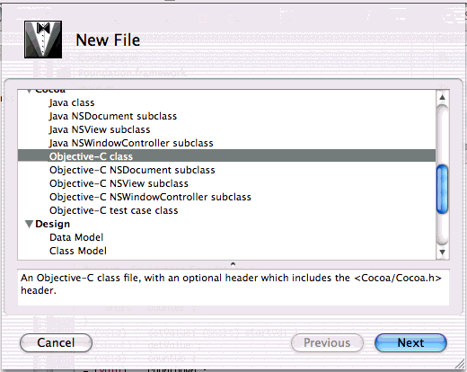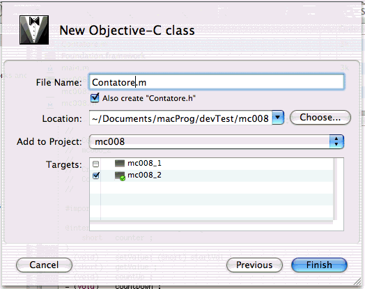 Torniamo a bomba, ovvero alla costruzione di una applicazione in Objective C. Bisogna definire una classe Contatore, dichiarare le variabili d'istanza e definire i metodi. La variabile d'istanza sarà una sola, ovvero una variabile che contiene un numero intero che fa da contatore. Per quanto riguarda i metodi, ci occorre un metodo per leggere il valore del contatore, uno per impostarlo, uno per incrementare il contatore ed uno per decremtnare il contatore. Facciamo partire il Xcode e scegliamo il menu New File.... Oh, che bello, mi mostra un dialogo che mi chiede il tipo di file che voglio fare. Mi pare ovvio che sceglierò una Classe in Objective C. Il risultato dell'operazione, una volta inserite le informazioni richieste (mi va bene quelle di default, ovvero costruire anche il file .h corrispondente, l'inserimento nel progetto e nel target attivo), è particolarmente carino. Xcode ha infatto già creato per me due file, il .m ed il .h, già riempiti con dei suggerimenti per la costruzione della classe.
