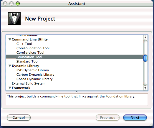 Cominciamo quindi col fare il progetto; apro XCode e scelgo, nella solita finestra dei template di progetto, un Foundation Tool; questo template dovrebbe comprendere il Foundation Framework, che contiene quindi tutte quelle classi che ci occorrono per lavorare. Manca l'Application Framework, le classi dell'interfaccia utente, ma ho appena stabilito che ne faccio a meno.