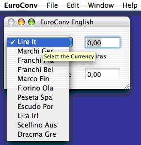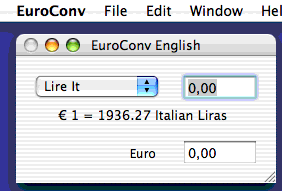 L'applicazione EuroConv presenta una interfaccia molto semplice: ci sono due campi di testo per contenere l'uno l'importo in Euro e l'altro l'importo in una delle valute dell'area Euro. Un menu poop-up permette di selezionare la valuta che si intende utilizzare (lire, marchi, franchi, eccetera), e contestualmente si modifica una stringa di testo che informa sul tasso di cambio in Euro di quella particolare valuta. Faccio prima a mostrare la figura che a descrivere oltre la cosa.