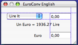 Comincio col disporre accortamente tutti i vari elementi dell'interfaccia. Allo scopo, mi faccio aiutare dalle linee guida, trattate nel capitolo precedente. Dispongo il campo valuta locale in modo che le due linee guida (azzurre nel mio caso) verticali ed orizzontali scattino nei pressi dell'angolo in alto a sinistra della finestra. Dopo di che, allineo il menu pop-upin modo che, di altezza uguale, corrisponda orizzontalmente. Il campo della valuta in Euro lo piazzo sotto il campo testo della valuta locale, e poi aggiungo due testi non editabili per contenere informazioni (in uno ci ho scritto semplicemente Euro e non lo cambierò mai, mentre l'altro campo avrà un contenuto variabile con la voce attiva del menu pop-up... intanto ci metto un testo di default relativo alle lire). Per aiutare ulteriormente il posizionamento degli oggetti, oltre alle linee dinamiche è possibile disegnale delle linee guida aggiuntive (voce Guide dal menu Layout di IB).