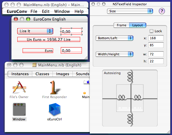 È possibile verificare subito cosa succede quando ridimensiono la finestra. Da IB allora scelgo Test Interface, e simulo il comportamento del programma. Mi limito a ridimensionare la finestra, e vedo che i vari elementi dell'interfaccia si comportano come desiderato. Più o meno: ci sono il menu pop-up ed il campo valuta locale che fanno degli strani movimenti, per non parlare del campo valuta in Euro che, dopo un po' di movimento, rimane attaccato al bordo superiore e da lì non si sposta... mah. Speriamo che l'applicazione vera e propria si comporti correttamente....