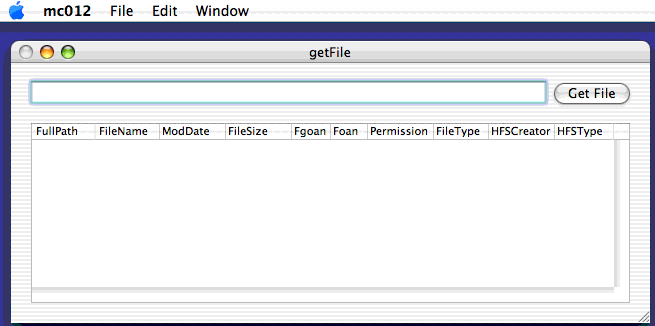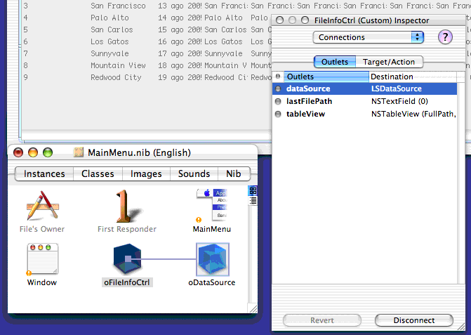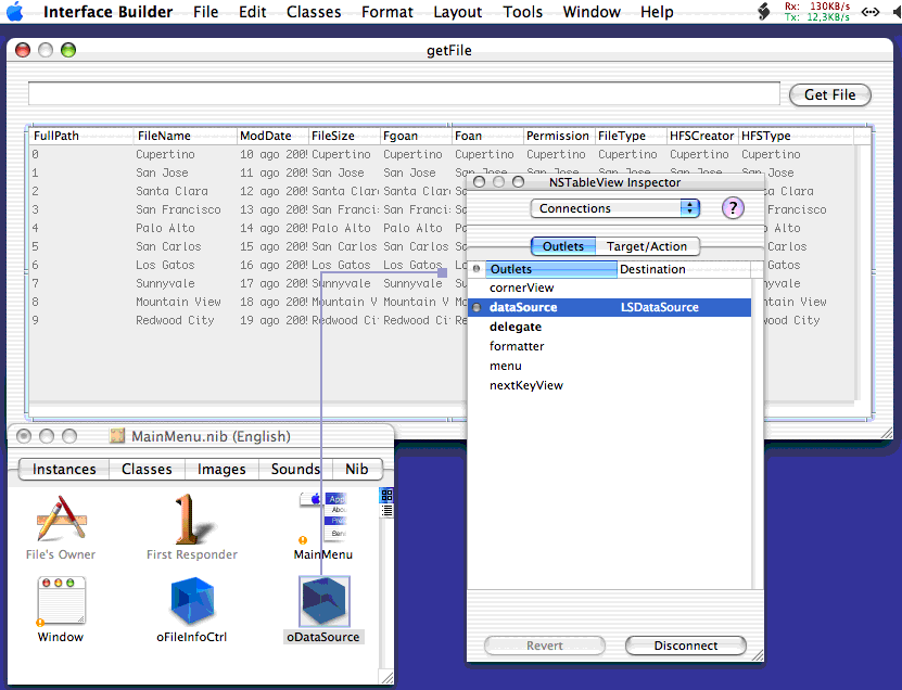 Mi occorre un pulsante per far partire le attività, un campo dove mettere il percorso completo del file (serve solo per verifica, visto che so già come lavorare con questo tipo di elementi) ed una tabella. La tabella è un oggetto della classe NSTableView, che si può inserire nell'interfaccia trascinando uno degli elementi della palette di IB. Costruisco subito una classe che funzioni da Controllore, la chiamo FileInfoCtrl, e genero una istanza dal nome oFileInfoCtrl. Collego con una action (lsGetFile) il pulsante alla classe controllore, e collego questa al campo di testo (outlet lastFilePath). Lascio temporaneamente da parte la tabella.
