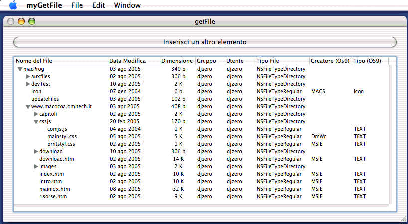 L'idea di partenza è sempre la stessa: abbiamo una finestra con un pulsante per selezionare un file o una directory, ed un elemento dell'interfaccia dove mostrare le informazioni relative. Ora, esiste un oggetto dell'interfaccia, NSOutlineView, che è molto adatto per presentare informazioni in maniera gerarchica. Infatti, NSOutlineView è ancora una volta un metodo per esplorare dati in maniera tabellare, ma questa volta è possibile raggruppare una serie di elementi sotto un unico genitore, e contrarre ed espandere questo genitore in modo che mostri o tenga nascosti i propri figli. Ho descritto in modo complicato la vista come lista del Finder...
