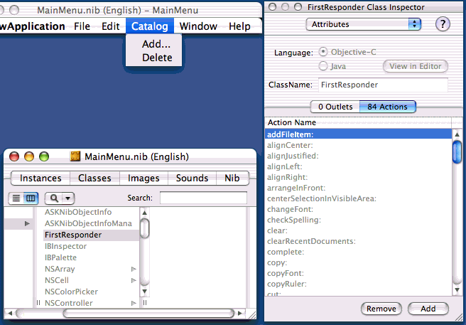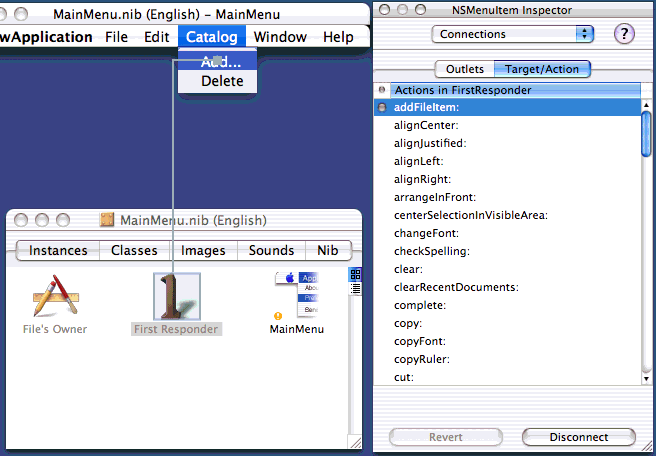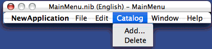 Mi viene quindi naturale associare ai due nuovi menu Add... e Delete una accoppiata target/action, inserendo l'azione come uno dei metodi della classe CatalogDoc.