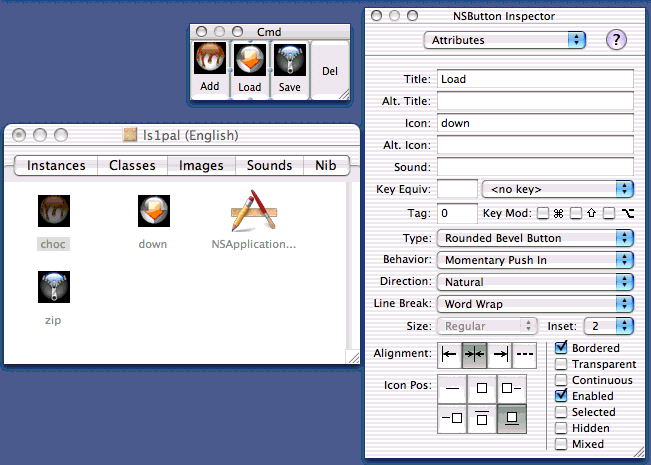 Come al solito, la prima cosa da fare è di entrare in IB e di costruire l'interfaccia utente. Se le due voci di menu Add... e Delete erano già state definite in precedenza, manca totalmente la palette. Come è giusto, questa si trova in un file nib separato, che chiamo ls1pal.nib (ovvero, la prima palette di livio sandel...). è una cosa molto semplice, prevedo quattro bottoni, uno per aggiungere elementi al catalogo, uno per eliminarli, uno per aprire cataloghi (equivalente alla voce di menu Open...) ed uno per salvare il contenuto dei cataloghi (equivale a Save).