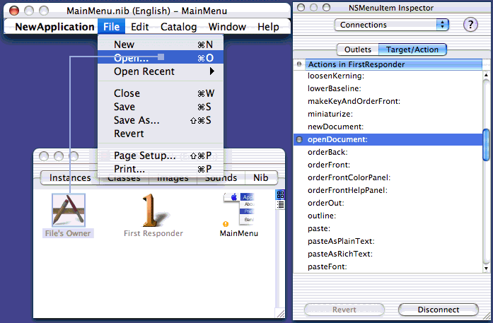 Adesso comincio la parte interessante, ovvero i collegamenti. Una cosa che era passata inosservata nel capitolo precedente, erano i collegamenti predefiniti del menu principale. Apro il file MainMenu.nib dentro IB, ed esamino le singole voci di menu. La maggior parte di queste è già associata ad una qualche operazione. Ad esempio, la voce"New ha già realizzato, nel paradigma target/action, il collegamento tra la selezione del menu e l'azione NewDocument. Sì, ma a chi è diretto il messaggio? Al First Responder, l'oggetto misterioso di questo paragrafo.