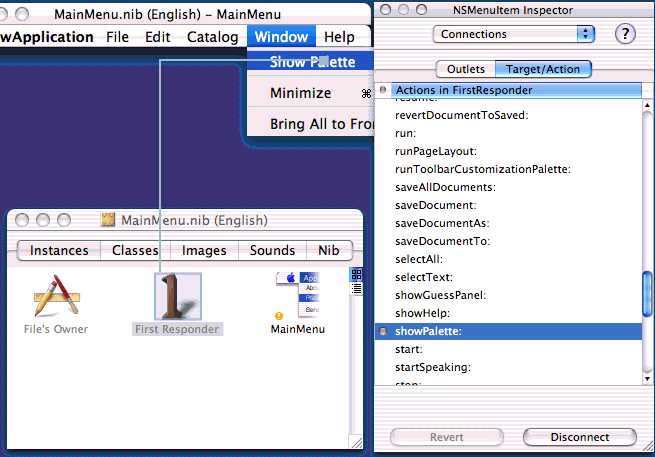 Non mi rimane adesso che aggiungere un meccanismo per visualizzare la palette. Torno in IB ed aggiungo una voce di menu Show Palette nel menu Window. A questa voce ci collego il metodo showPalette: che mi sono premunito di definire all'interno di First Responder. Poi, all'interno della classe CatalogDoc, aggiungo in XCode il metodo corrispondente: