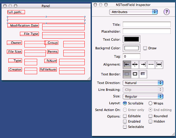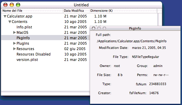 La finestra principale del catalogo è nata densa di informazioni, e si è via via spopolata. In effetti, terrei il nome del file, la data di modifica e la dimensione. La visualizzazione del resto è più o meno opzionale. Decido quindi di realizzare una finestra aggiuntiva in cui, dato un file, sono riportate per esteso le informazioni (il gruppo, il proprietario, il path completo, i permessi, eccetera). La finestra dovrebbe funzionare come la corrispondente finestra del Finder: selezionando un elemento all'interno del catalogo, automaticamente sulla finestra di info compaiono le informazioni pertinenti.