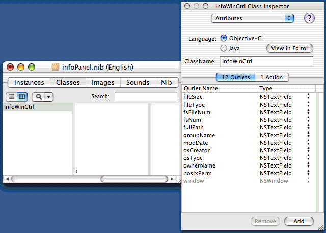 Con questa, siamo alla terza finestra che deve essere unica all'interno dell'applicazione: c'è la palette dei comandi, poi la finestra delle preferenze, ed adesso questa finestra delle informazioni. Seguendo Learning Cocoa, utilizzo un altro (e tre) meccanismo per fare ciò; consiste nel definire una nuova classe, AppDelegate, tramite IB e direttamente all'interno del file MainMenu.nib. Alla classe aggiungo una action, showInfoPanel, che invita la finestra a farsi vedere. Faccio una istanza di questa classe, e collego la voce di menu seguendo il paradigma target/action. A questo punto torno in XCode e scrivo il metodo: