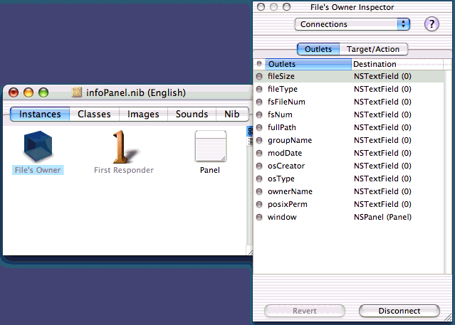 Ho collegato tramite una lunga sequenza di outlet il File's Owner ai vari campi della finestra, in modo da poterli riferire facilmente. Salvo tutto.