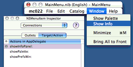 Adesso devo collegare una qualche voce di menu con la finestra delle informazioni. Rimango in IB ed apro MainMenu.lib, dove appunto si trova il menù dell'applicazione. Aggiungo una voce di menu proprio sotto la simile voce che attiva la palette dei comandi; la chiamo Show Info. Ora si tratta di attribuire a questa voce un qualche metodo che apra la finestra.