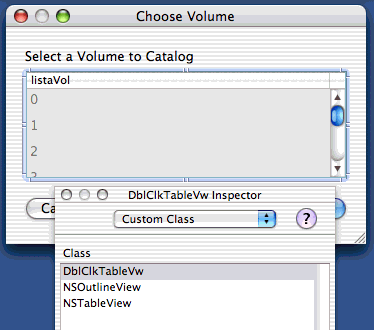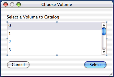 Per realizzare una finestra modale destinata a diventare una sheet, non seguo particolari precauzioni. Vado in IB, costruisco un oggetto della classe NSPanel, lo riempio con del testo, una NSTableView e due pulsanti, uno di Select e uno di Cancel. Nella NSTableView mostro l'elenco dei volumi, con Select dico di catalogare il volume selezionato. Cancel, ovviamente, interrompe la sessione e fa nulla.