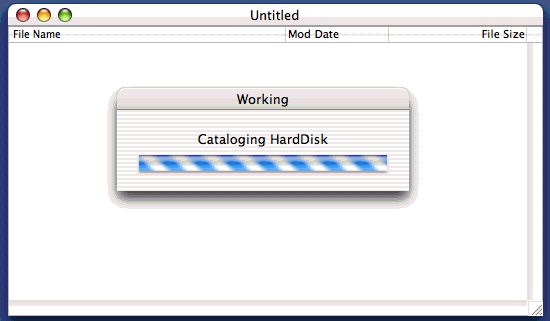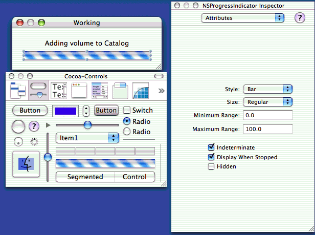 Visto che l'operazione di catalogazione è piuttosto lunga, è grazioso informare l'utente dell'attesa mostrandogli una finestra di cortesia. La cosa più bella sarebbe mostrargli una barra che si colora con l'avanzamento delle operazioni (come molti programmi di installazione ci hanno abituato); tuttavia, nella catalogazione al momento ignoro lo stato di avanzamento. Sfrutto allora una barra tipo barbiere, ovvero una barra con righe animate bianche ed azzurre. Vado ancora una volta in IB e costruisco una finestra, con un testo e un oggetto della classe NSProgressIndicator (la citata barra del barbiere). La chiamo WaitingPanel, faccio come al solito un controllore WaitPanCtrl, outlet e collegamenti vari (vado via veloce, ormai ne ho fatte a bizzeffe di queste finestre).