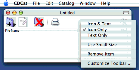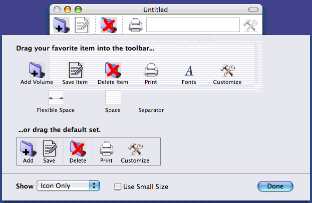 Pensavo che l'aggiunta di una tale caratteristica alle mie finestre di catalogo fosse un'impresa improba; invece, si è rilevata molto semplice. Non solo: a puro titolo gratuito, Cocoa fornisce anche un menu ed un dialogo di personalizzazione della toolbar stessa. Anche se il lavoro mi è stato facilitato da un esempio di Apple a corredo dei Developer's Tools, la faccenda è veramente semplice.