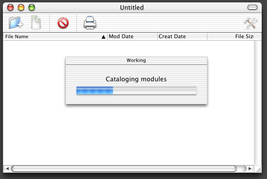 Mostro la finestra di attesa, apro la sessione modale e poi esamino ordinatamente tutti i volumi. Man mano che trovo un file, faccio fare un giro alla barra.