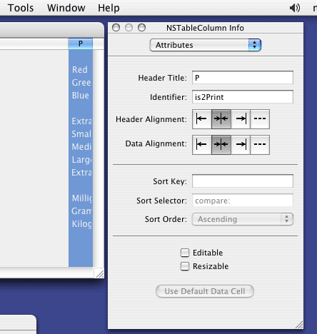 Poi arriva la parte divertente. In primo luogo stabilisco che la colonna che visualizza la variabile è sempre presente (come il nome del file). Per fare questo, il metodo più spiccio è di intervenire con Interface Builder ed aggiungere direttamente nell'interfaccia la finestra. Bisogna fare attenzione al come si attribuisce il nome della colonna, visto che sfrutto un meccanismo per ricavare il valore di una cella a partire dal nome della colonna. Dico poi che la colonna avrà una dimensione fissa: per ottenere ciò, spunto l'apposito pulsante nella finestra di informazioni relativa alla colonna scelta.