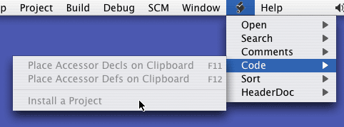 Volevo notare una funzionalità presente in XCode, ovvero un menu che raccoglie una serie di script utili per la programmazione. Tra questi script ce ne sono un paio che aiutano la scrittura dei metodi accessor: sono le voci Place Accessor Decls on Clipboard e Place Accessor Defs on Clipboard del sottomenu Code. Il funzionamento è molto semplice: si selezionano le righe che contengono la variabili d'istanza e si esegue il comando da menu. Negli appunti sono presenti tutte le dichiarazioni delle funzioni (nel primo caso) oppure il codice vero e proprio delle funzioni accessor (il secondo caso).