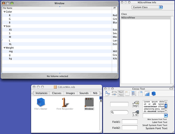 Passo adesso a costruire la finestra, e quindi alla classe ListWinCtl. Nella versione precedente, la finestra era meglio caratterizzata attraverso il codice del metodo windowControllerDidLoadNib:. Questo metodo è specifico di NSDocument, e qui non può essere utilizzato (non è vero, ripensandoci lo si potrebbe fare, tuttavia è meglio procedere in altro modo). Si utilizza il metodo windowDidLoad tipico degli oggetti NSWindowController. Presumo che quando il file NIB sia stato interamente caricato, sia inviato all'oggetto NSWindowController il messaggio windowDidLoad. Sospetto che la versione di default si limiti ad inviare il messaggio windowControllerDidLoadNib: al documento cui il controllore appartiene.