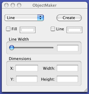 Infine, ci sono quattro campi di testo all'interno dei quali scrivere quattro coordinate, o meglio due coppie di valori. Senza stare troppo a sottilizzare (questa finestra sparirà o cambierà sostanza spero molto presto), nel caso di linea, si determinano i due punti, iniziale e finale, della linea. Nel caso di rettangolo o ellisse, il punto di partenza e le due dimensioni lunghezza e larghezza.