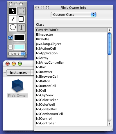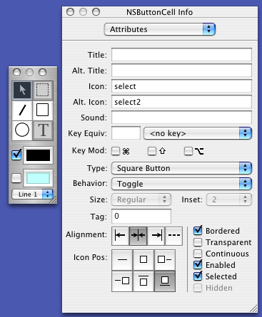 Ho già utilizzato una matrice di oggetti, quando ho preparato la finestra per la selezione delle preferenze di visualizzazione delle colonne. Da lì riciclerò concetti ed anche pezzi di codice. La gestione delle NSColorWell ho visto essere cosa facile, ed anche il menu pop-up non mi preoccupa. In effetti il punto più difficile di tutta la finestra è stato il disegno dei pulsanti. Sono notoriamente incapace di disegnare qualcosa di visibile senza vergogna. C'è da considerare il fatto che ogni pulsante si presenta secondo due aspetti: selezionato e deselezionato. Confesso che non ho letto attentamente la documentazione, ma ho sperimentato un po'. Ho scoperto che un comportamento decente per la palette si ottiene configurando la matrice nel modo radio, che consente la selezione di un solo elemento alla volta (ed automaticamente deselezionando tutti gli altri); e poi configurando i pulsanti come square button con comportamento (behaviour) Toggle. Ho così disegnato per ogni pulsante due bitmap, una con aspetto normale ed una con aspetto selezionato (che è l'aspetto normale con colori invertiti), e le ho attribuite come Icon e come Alt. Icon. Termino così le operazioni con Interface Builder e torno in XCode per scrivere un po' di codice.