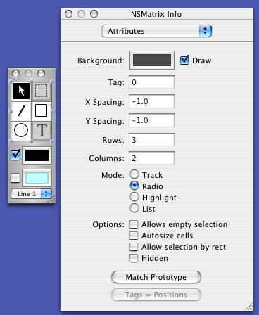 Come ogni buona applicazione per disegnare qualcosa, occorre predisporre una palette degli strumenti. Mi disegno quindi con Interface Builder una simpatica finestra che contenga qualche strumento di facile uso. Comincio con una matrice di pulsanti, per avere uno strumento di selezione, uno strumento per le linee, uno per i rettangoli, per le ellissi; per i testi lo prevedo ma lo lascio disabilitato, poi mi resta un buco vuoto, e lo lascio lì per future estensioni.