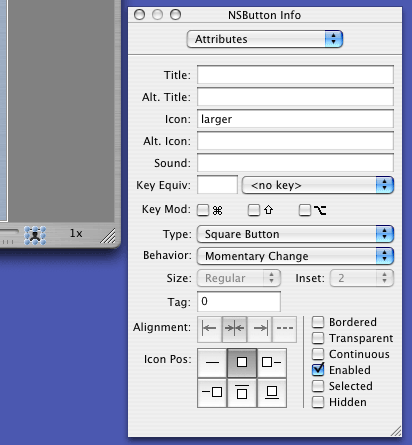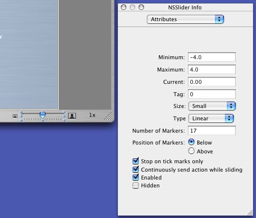 Ma comincio con il preidsporre l'interfaccia utente per fare lo zoom. Mi ispiro un po' a quello che fa l'applicazione iPhoto. Predispongo cioè in basso a destra della finestra uno slider con due piccole immagini ai lati. Uso lo slider come un controllo per dare il fattore di zoom, e le immagini ai lati per fissare lo zoom massimo e lo zoom minimo.