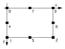 Le cose si complicano quando il clic è sopra uno degli handle di mezzo. Supponiamo clic sullo handle 7. Posso indifferentemente scegliere il vertice 1 o 2: entrambi non cambieranno coordinate. Come handle mobile, posso scegliere ancora i vertici 0 o 3; in ogni caso, entrambi variano la coordinata y (che ho indicato col codice 1). Quindi, l'ottavo elemento dei vettori (indice numero 7) sono rispettivamente 2, 0 e 1.