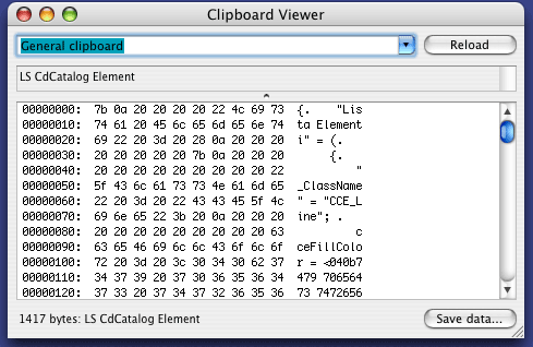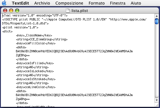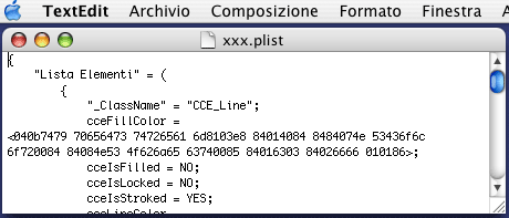 Non sapendo come realizzare le operazioni di copia ed incolla sulla finestra che contiene la copertina, sono andato a guardare un esempio, ovvero Sketch, fornito di serie con i Developer's Tool. Nel farlo, ho notato che gli elementi grafici sono passati nella clipboard (o Archivio Appunti) in formato XML. è una cosa simpatica ed interessante, ed anche piuttosto facile.