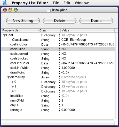 Costruisco un dizionario, all'interno del quale inserisco, con opportune chiavi, le varie variabili d'istanza in un formato opportuno. Numeri, rettangoli, punti, eccetera, sotto forma di stringhe, mentre oggetti più complicati (come NSColor) in un formato d'archivio. Da notare che all'inizio è inserito anche il nome della classe dell'elemento. In effetti questo sarà un punto chiave per la procedura opposta, che costruisce un elemento a partire da una property list. La procedura è divisa in due metodi: il primo metodo serve proprio a costruire un elemento: