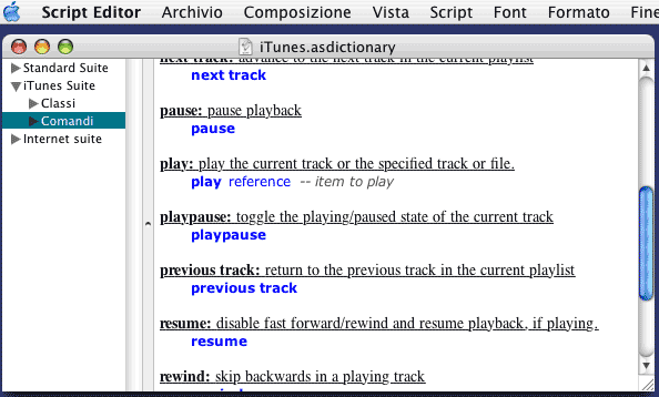Si può conoscere l'intera serie di comandi e di proprietà AppleScript messe a disposizione da iTunes consultando il dizionario AppleScript di iTunes stesso; basta usare Script Editor e la voce di menu apposita (Apri Dizionario...).