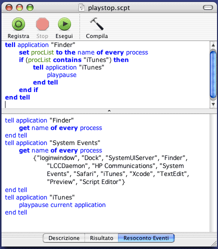 Per prima cosa, si interagisce con il Finder; alla variabile procList attribuisco la lista delle applicazioni in quel momento in esecuzione. Se all'interno di questa lista compare iTunes, allora comunico direttamente con iTunes. Dico di eseguire il comando playpause. Questo comando serve a modificare lo stato corrente di riproduzione: se è attiva, ferma la riproduzione, se ferma, l'attiva.