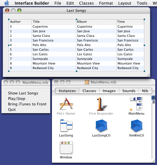 Il menu è un altro menu rispetto al MainMenu prodotto di default da XCode; è infatti il menu che poi sarà inserito nella barra principale dei menu, e non il menu dell'applicazione (che per altro non vorrò mai utilizzare). La finestra aggiuntiva serve solo per mostrare in piena gloria (cioè con tutti gli attributi ricavati da iTunes) le canzoni suonate di recente, ma non ha un uso sensato. Questa finestra è visualizzata quando si seleziona la voce Show Last Song dal menu.