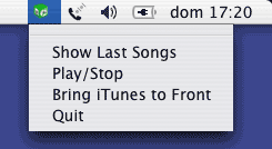 La voce di menu Play/Stop avvia o ferma la riproduzione, e dovrà essere associata all'esecuzione del primo script sopra presentato. La voce Bring iTunes to the front intende portare davanti a tutte le alpre applicazioni iTunes. Se iTunes non è attivo, lo lancia direttamente. Infine la voce Quit esce dall'applicazione; è presente esplicitamente dal momento che il menu standard dell'applicazione non sarà visualizzato.