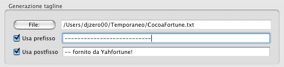 Per prima cosa, inserisco nuove grandezze nel file delle preferenze. Il nome del file è ovviamente la prima cosa, poi aggiungo due valori booleani per inserire o meno una riga di prefisso e di postfisso (si dirà così) al fortune generato. Va da sé che poi devo aggiungere nelle preferenze le due stringhe desiderate. In questo modo, inserendo sia il prefisso che il postfisso, il contenuto del file risulta qualcosa del tipo: