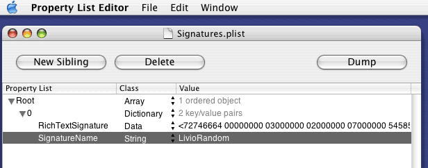 Ho cercato a lungo un modo per interpretare tale file (che è la rappresentazione XML di una array di signature, dove ogni signature è un dizionario con due termini, il nome della signature ed il testo vero e proprio). Dopo molto penare, e senza avere una soluzione in tasca buona in ogni occasione, ho deciso di utilizzare un Applescript che piloti direttamente Apple Mail. Ma nemmeno in questa versione funziona come vorrei, per cui presumo che modificherò ancora...