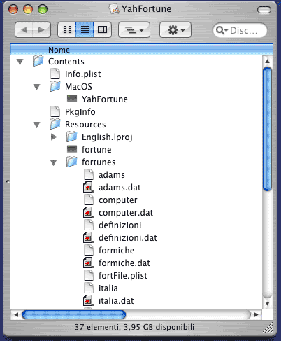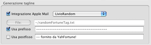Va da sé che mentre il testo della signature è quello generato dall'applicazione YahFortune, occorre conoscere il nome della signature utilizzato. Ovviamente, tale nome si trova all'interno del file delle preferenze. L'integrazione con Mail o la scrittura su file dipende ancora dalle preferenze: