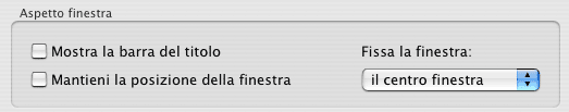Ho individuato cinque modi per gestire la posizione della finestra, tenendo fisso uno tra i cinque punti notevoli (i quattro angoli, oppure il centro). Ovviamente, la scelta della modalità è come al solito gestita dal pannello delle preferenze, dove è possibile anche indicare se ricordare la posizione della finestra tra un lancio ed il successivo. Non c'è nulla di particolarmente interessante nella gestione del menu pop up, per cui passo direttamente a come l'applicazione gestisce la situazione.