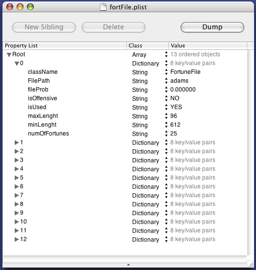 A parte il pulsante di spunta per l'integrazione o meno con Mail, c'è un menu pop-up che permette di scegliere quale signature di mail utilizzare (presuppongo che tale signature esista già; ne segue che YahFortune la modifica). Questo menu deve essere riempito con l'elenco delle signature presenti. L'operazione avviene all'interno del metodo mainViewDidLoad. La cosa è più semplice del previsto; sfrutto infatti il fatto che il file Signature.plist è una property list che rappresenta un NSArray di NSDictionary (come lo so? guardando il file, mi sembrava... ho provato... è andata). Quindi il metodo arrayWithContentsOfFile è sufficiente per costruire l'oggetto NSArray a partire dal file. Poi ho spazzato il vettore e ne ho estratto i nomi dal dizionario usando la chiave apposita. Questi nomi li ho inseriti man mano come voci del menu.