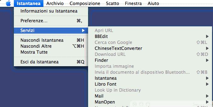 Una delle caratteristiche di Mac OS X è la presenza, in ogni applicazione, del menu Servizi, proprio all'interno del menu principale di ogni applicazione.