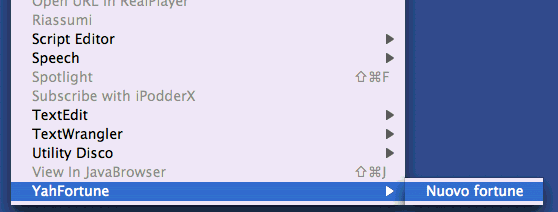 Qui le normali applicazioni possono inserire delle voci tali da attivare alcune funzioni proprie dell'applicazione. Ad esempio, l'applicazione Mail inserisce delle funzioni: una per inviare una mail all'indirizzo che si suppone selezionato all'interno di una qualche altra applicazione, oppure per inserire il testo selezionato (in un contesto generico, anche nel Finder) in una nuova mail; cose del genere. Il mio intento è di aggiungere una voce a questo menu che produca, utilizzando tutto quanto già sviluppato finora in YahFortune, una stringa con un nuovo fortune.