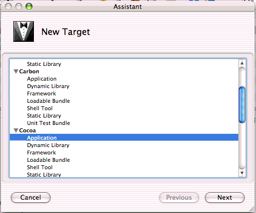 A questo punto, sono pronto per creare all'interno del progetto un nuovo Target per la realizzazione del servizio. Aggiungo quindi il target YahFortuneSrv, scegliendo tra le varie possibilità quella di una applicazione Cocoa.