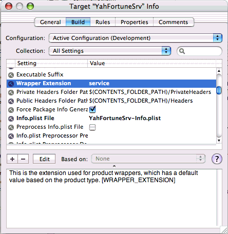 Ci sono due importanti modifiche da fare sulle opzioni di default del target. La prima consiste nel cambiare l'estensione del prodotto compilato da .app a .service. Per fare questo, devo aprire la finestra delle informazioni del target, e poi, nel tab Build, modificare la voce apposita.