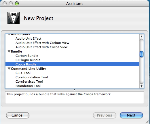Un plugin non è un'applicazione Cocoa, non è un tool per linea di comando, non è alcuna delle voci presenti nella finestra che compare quando si costruisce un nuovo progetto con XCode. Cosa fare allora?