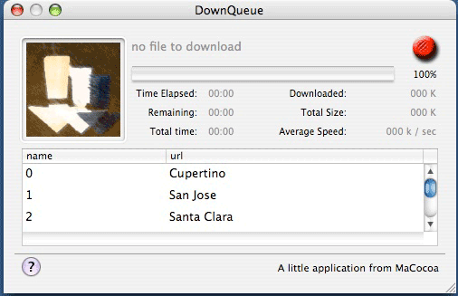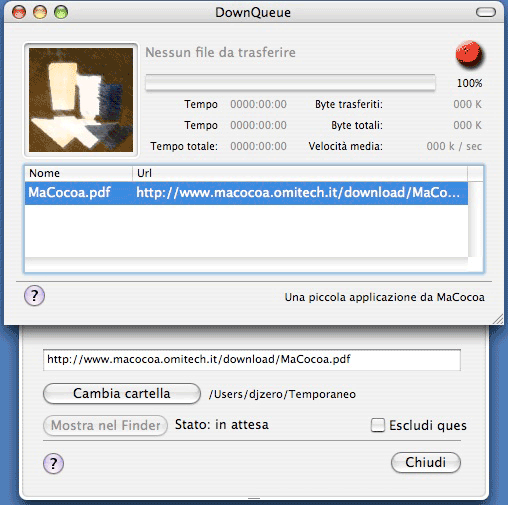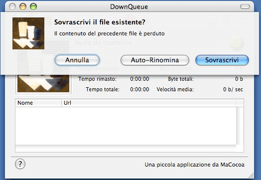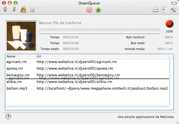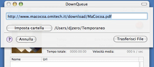 L'idea è di trasferire una lista di file, non tanto in parallelo (come ad esempio avviene con Safari o con altri programmi che funzionano da acceleratori del trasferimento; un giretto su VersionTracker o siti similari ve ne fornirà qualcuno migliore di quello che andrò a produrre), quanto in serie, uno dopo l'altro. La cosa nasce da una mia esigenza personale, che consiste nel mettere da parte una lista di file (di dimensioni generose), che poi sono trasferiti con comodo durante la notte o comunque mentre non sono presente davanti al computer (tranquilli, nulla di illegale in tutto ciò).