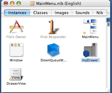Per visualizzare informazioni sui singoli file, ho pensato di utilizzare un Drawer, anche perché non ne ho mai utilizzato uno e voglio vedere come si fa. Per aggiungere un drawer ad una finestra, non ho nemmeno letto una riga di documentazione. Ho utilizzato Interface Builder, aggiungendo un oggetto NSDrawer direttamente all'interno del MainMenu.nib. Quest'operazione non ha però introdotto una zona dove disegnarne il contenuto; bisogna quindi aggiungere anche una NSView. L'ho fatto droppando sopra l'icona dell'oggetto myDrawer una CustomView prelevata dalla pelette degli oggetti di Interface Builder. L'operazione, contestualmente, imposta l'outlet contentView di myDrawer alla view appena inserita, e mostra tale view in una finestra a parte di Interface Builder (che non corrisponde però ad una finestra dell'applicazione). Bisogna anche collegare l'outlet parentWindow di myDrawer alla finestra madre (nel mio caso, l'unica finestra operativa dell'applicazione) e, nel mio caso, il delegate per lasciare fare al controllore della finestra alcune operazioni. In effetti, il collegamento tra finestra e drawer si effettua dall'altro lato non tanto dalla finestra, quanto attraverso il controllore della finestra (il mio DownQueueWinCtrl). Anche tutti i controlli del drawer sono stati collegati tramite outlet a DownQueueWinCtrl, come pure questo controllore è il riferimento per le operazioni scatenate dai controlli del drawer. Così facendo la classe controller diventa piuttosto piena di outlet, e forse valeva la pena separare o semplificare la gestione in altro modo. Tuttavia, data la semplicità dell'applicazione, lascio tutto così.