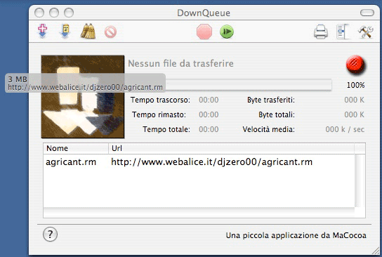Ci sono un'ampia zona sulla sinistra (un'immagine che sarà anche l'icona dell'applicazione) sulla quale si possono droppare dei collegamenti per inserirli nella lista dei trasferimenti. A completare la fascia superiore le informazioni relative al file in corso di trasferimento, con nome, stato di avanzamento, ed anche tutte le informazioni che si potranno ricavare in termini di tempo trascorso e residuo, e byte trasferiti. Una immagine rossa, gialla o verde rende conto dello stato corrente del trasferimento: rosso indica nessun trasferimento in corso, giallo indica trasferimenti attivi ma coda vuota, ed infine verde indica trasferimento in corso.