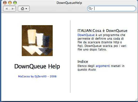 A completamento dell'applicazione, ho realizzato una cosa che solo qualche ottimista inguaribile potrebbe definire help (ed in più solo in italiano). Ho scritto qualche pagina in HTML, facendo bene attenzione ad utilizzare quanto Apple consiglia nella realizzazione. La pagina principale dello Help contiene un meta tag del tipo: